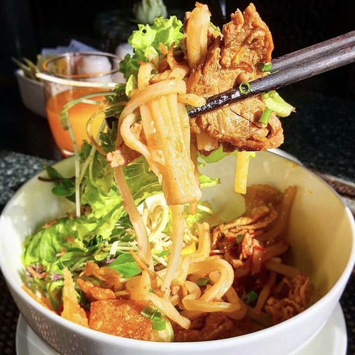 Рисовая лапша с мясом свинины и хрустящими крекерами. Готовят только в Хойане — больше нигде.